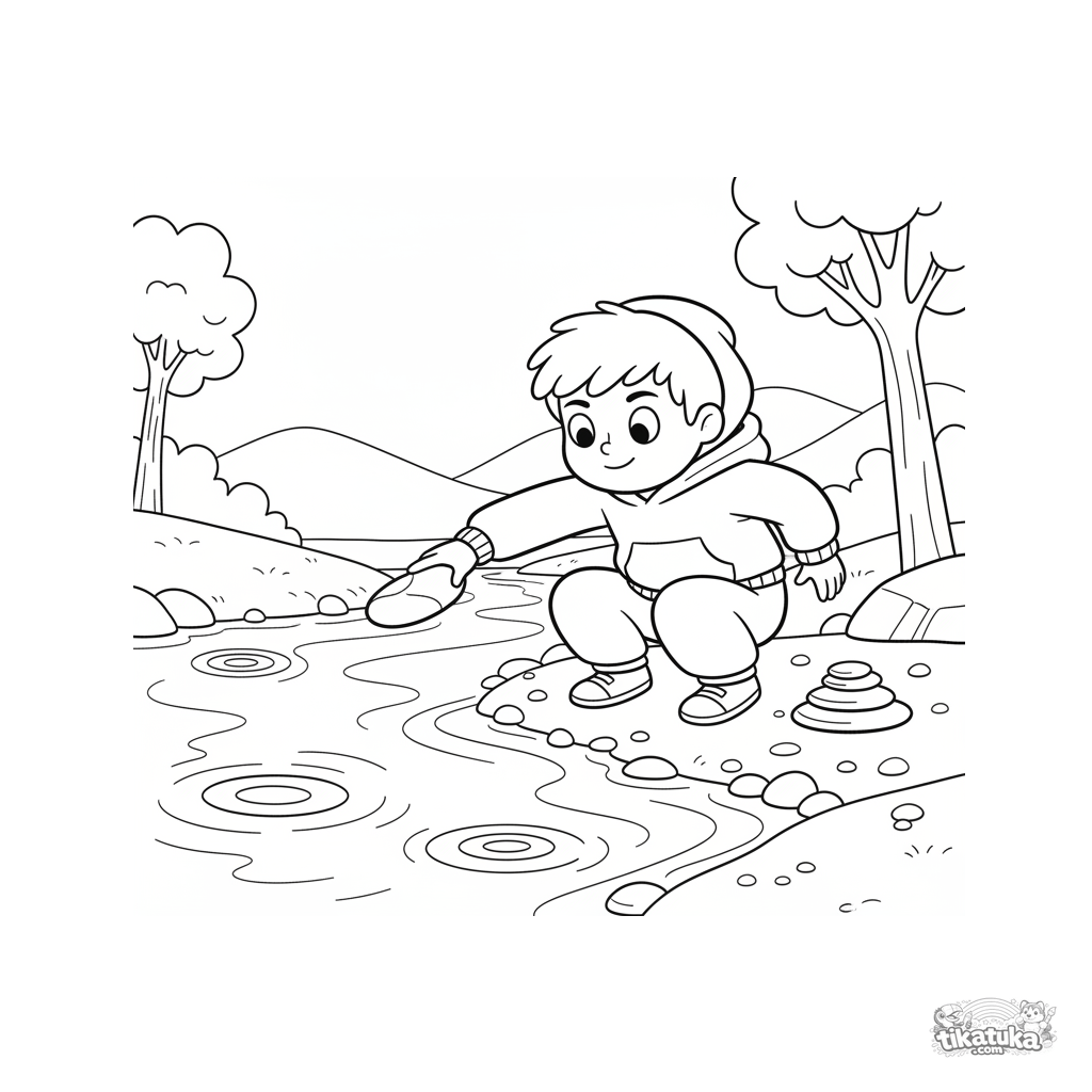 Раскраска для детей 7-9 лет: ребёнок пускает плоские камушки по воде ручья. Динамичная поза, узнаваемая летняя забава в стиле 90-х мультфильмов.