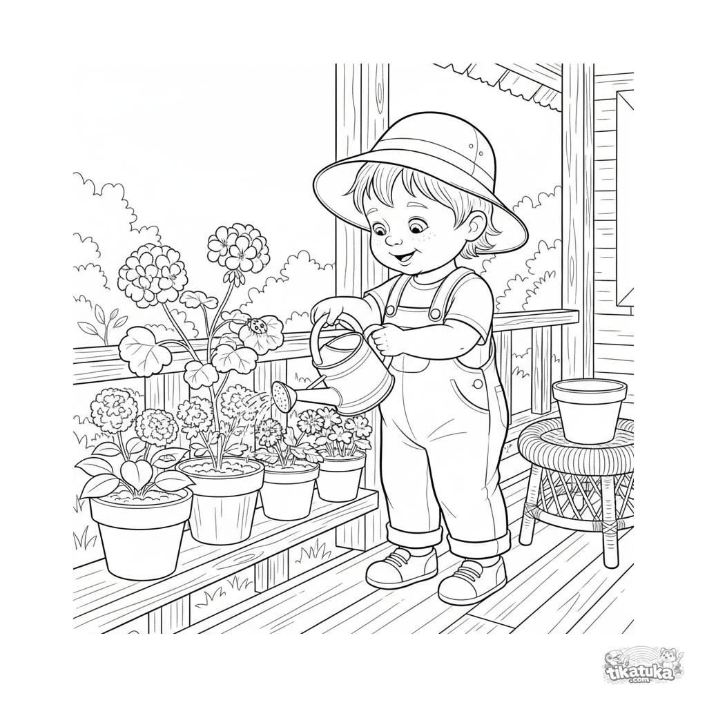 Раскраска для детей 4-6 лет: ребенок в одежде поливает цветы в горшках на веранде дачи. Средняя детализация, милая и спокойная сцена.