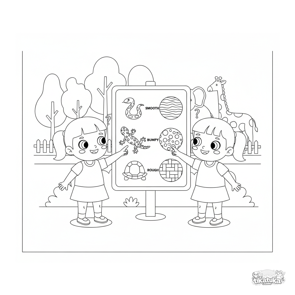 Раскраска для детей 7-9 лет: дети изучают разные текстуры чешуи рептилий на тактильной табличке в зоопарке. Образовательная сцена в стиле бумажной аппликации.