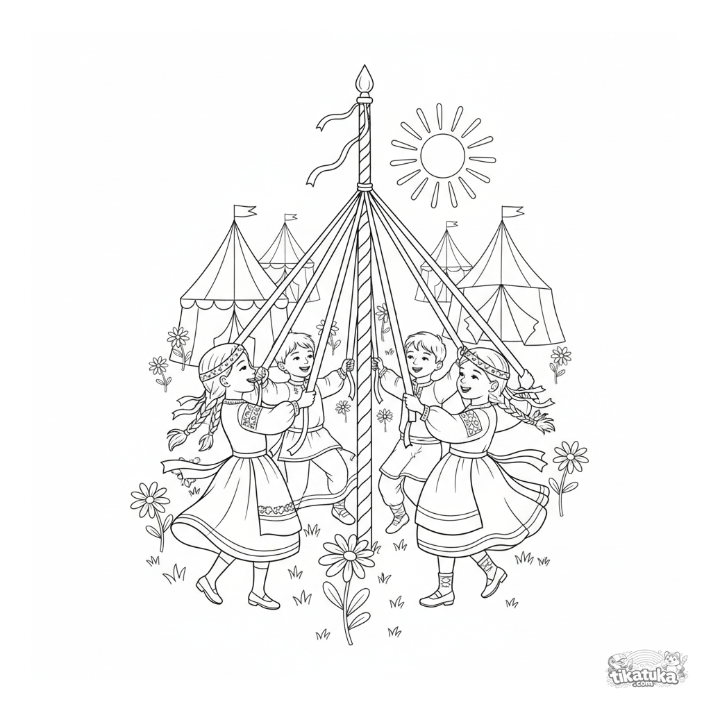 Раскраска для детей 4-6 лет: весёлые дети в народных костюмах танцуют с лентами вокруг майского дерева на праздничном поле. Яркая и динамичная фольклорная сцена.