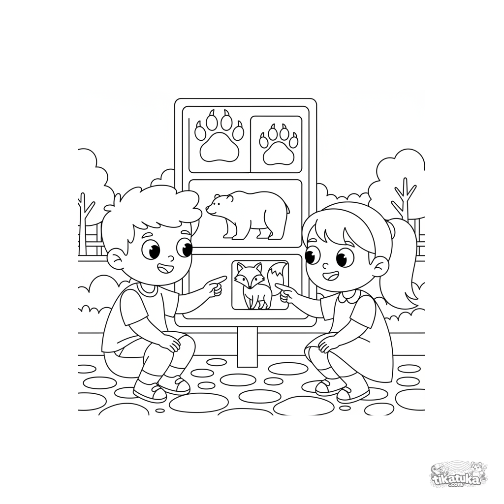 Раскраска для детей 7-9 лет: друзья изучают следы животных на интерактивной табличке в зоопарке. Сцена с элементами игры и обучения.