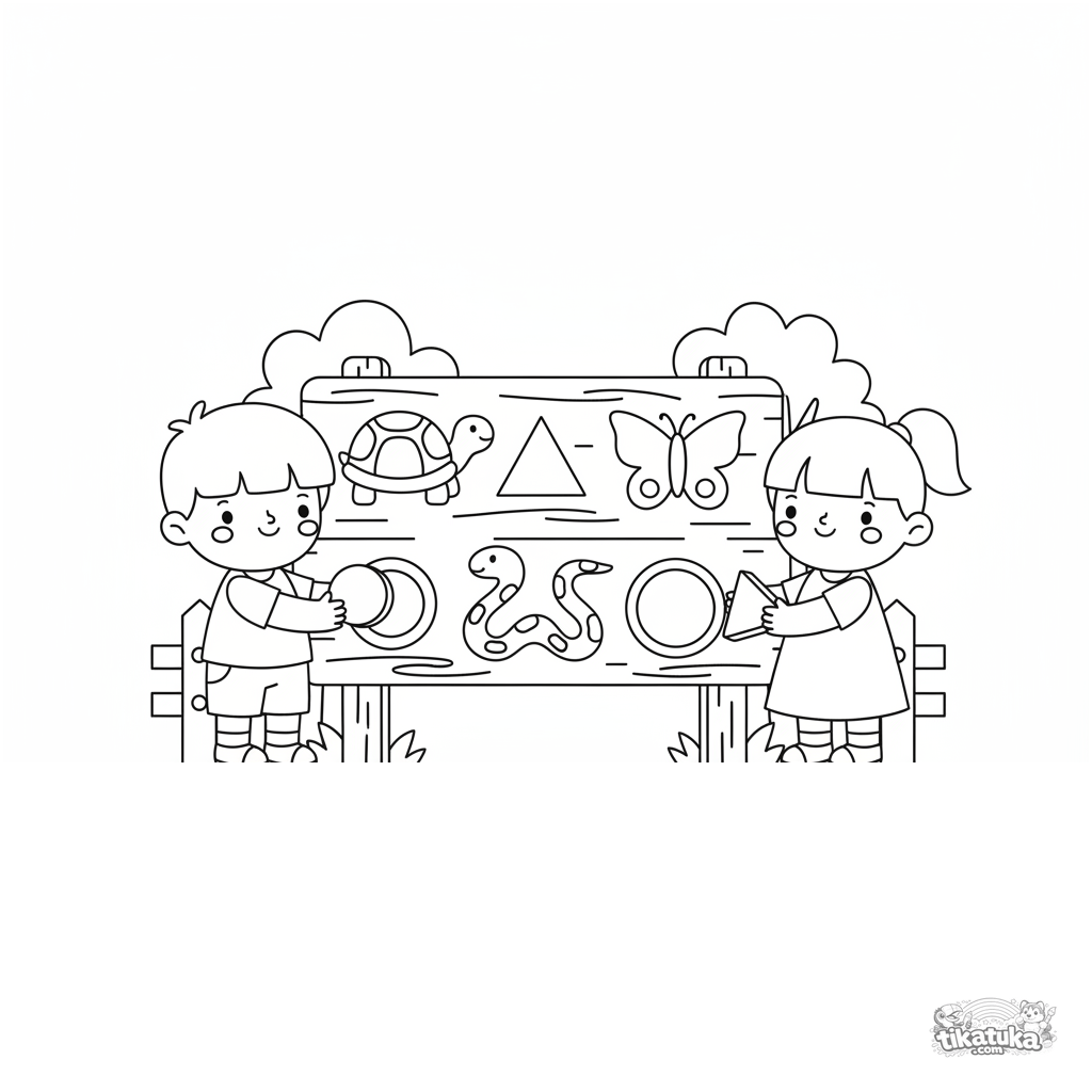 Раскраска для детей 7-9 лет: дети сопоставляют геометрические фигуры с силуэтами животных на интерактивной табличке в зоопарке. Обучение через игру.