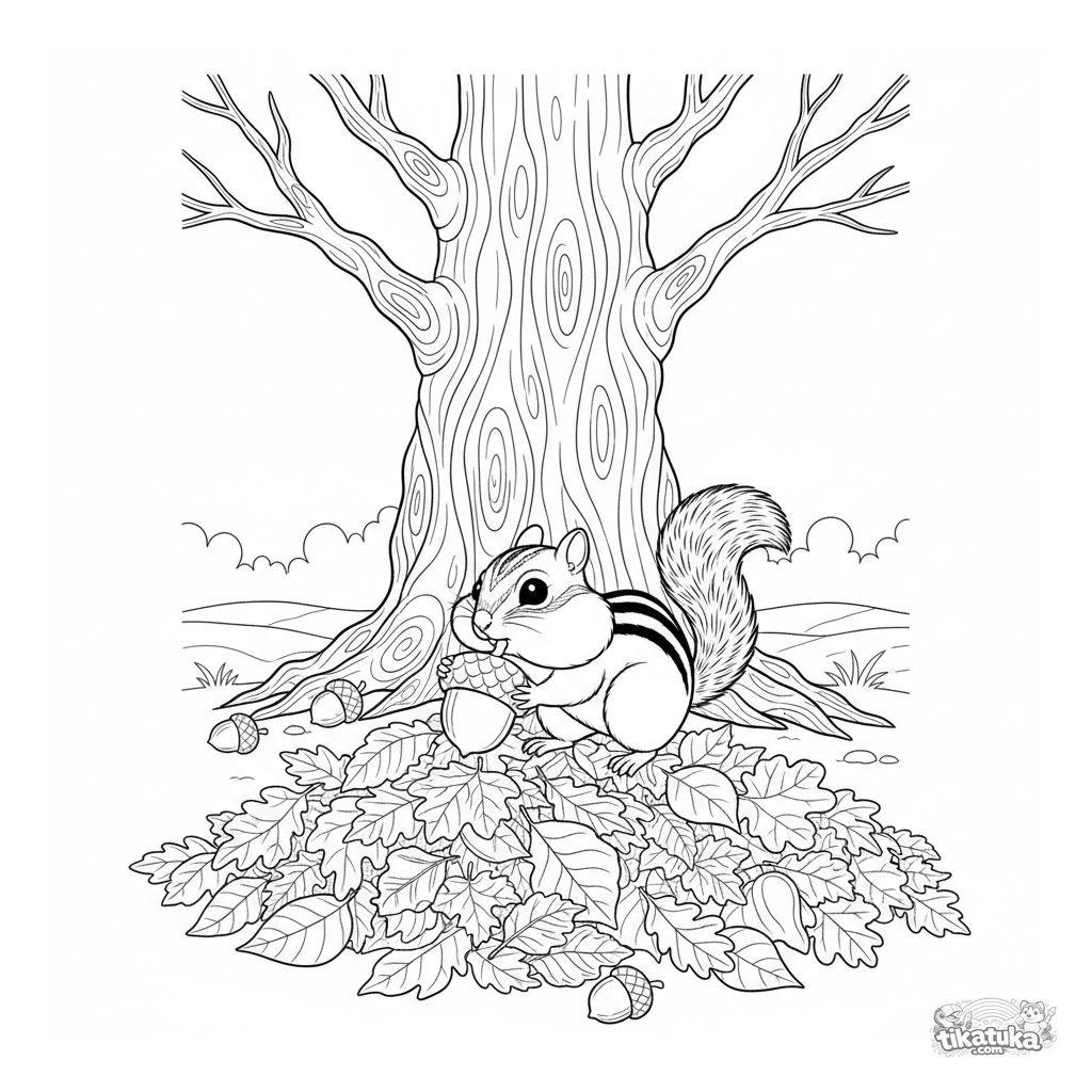 Раскраска бурундука, собирающего желуди под осенним дубом. Для детей 4-6 лет. Сцена в осеннем лесу с разноцветными листьями.