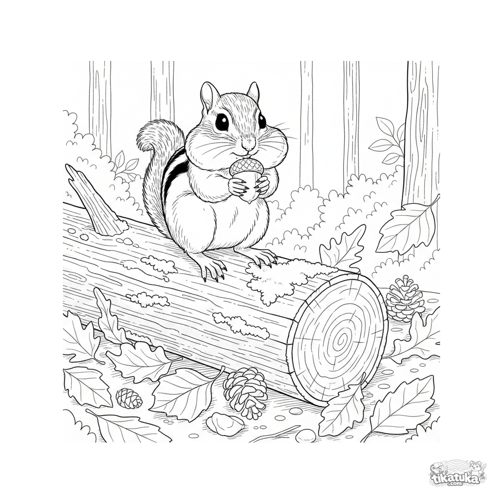 Раскраска с бурундуком в осеннем лесу. Для детей 4-6 лет. Зверёк сидит на замшелом бревне и держит жёлудь среди опавших листьев.