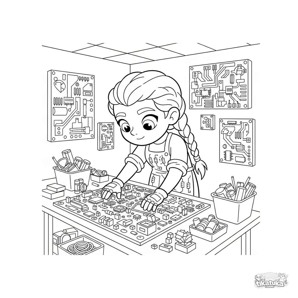 Раскраска для детей 10-12 лет: художник создает мозаику из печатных плат в подвальной мастерской. Много деталей: компоненты, инструменты, готовые арт-объекты на стенах.