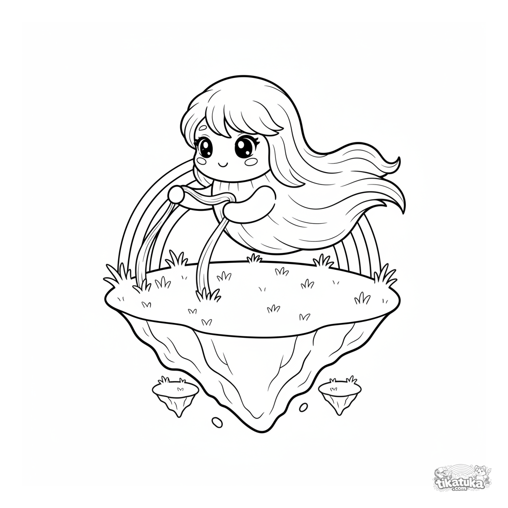 Раскраска для детей 7-9 лет: воздушный облачный дух ткет маленькую радугу из тумана над летающим островом. Изящная, волшебная сцена с плавными линиями.