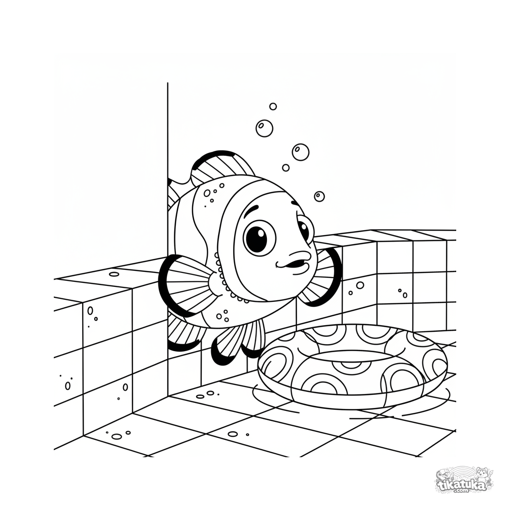 Детальная реалистичная раскраска для детей 10-12 лет: рыба-клоун с полосатым телом выглядывает из угла бассейна рядом с надувным кругом. Анатомически точные линии и текстуры чешуи.