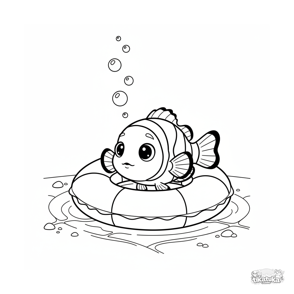 Раскраска для детей 7-9 лет: полосатая рыба-клоун робко выглядывает из центра надувного круга на дне бассейна. Мягкие округлые формы, милая сцена.