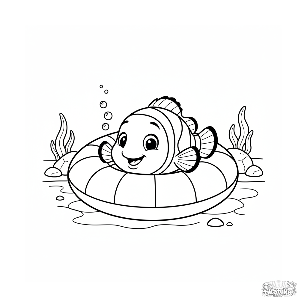 Раскраска для детей 7-9 лет: игривая рыба-клоун выглядывает из туннеля надувного круга, лежащего на дне бассейна. Выразительная мордочка, композиция-рамка.