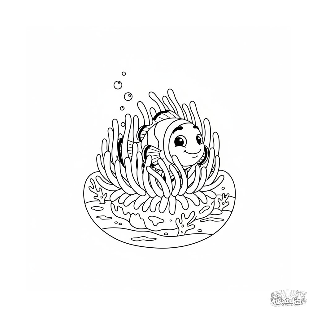 Весёлая раскраска в стиле 90-х: рыба-клоун выглядывает из анемоны на солнечном коралловом рифе. Для детей 4-6 лет. Яркие выразительные формы.