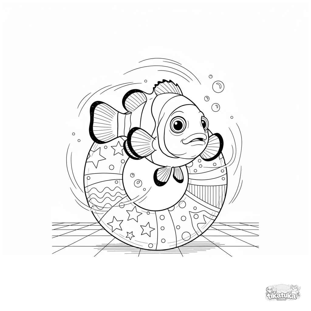 Динамичная раскраска: рыба-клоун стремительно проплывает сквозь отверстие надувного круга на дне бассейна. Для детей 10-12 лет. Детализированное изображение движения.