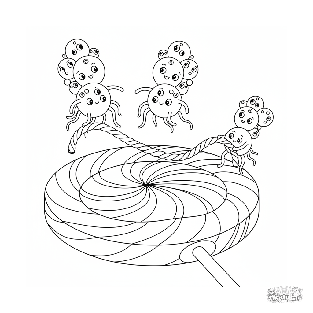 Детальная раскраска для детей 10-12 лет: микробы в виде гроздей винограда весело играют в скакалку на поверхности гигантского леденца.