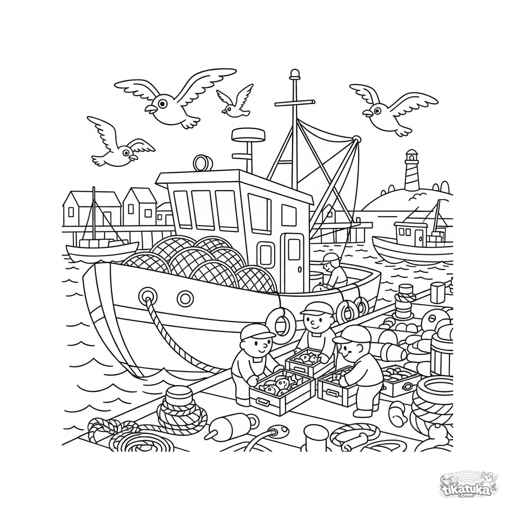 Раскраска для детей 7-9 лет: яркий рыболовный траулер разгружает улов в оживлённом порту. Сцена в современном плоском векторном стиле с деталями.