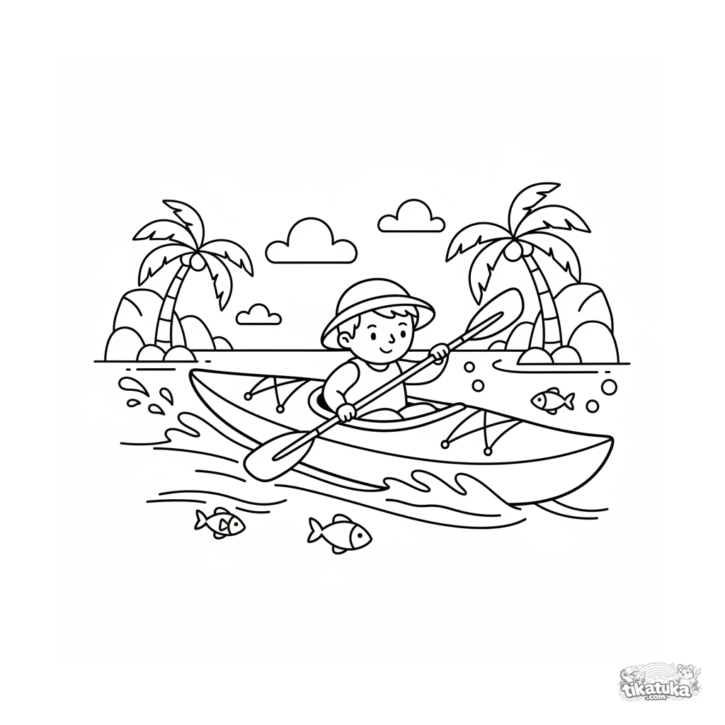 Раскраска для детей 4-6 лет: быстрый каяк мчится по тропической бухте. Яркие, чистые формы и динамичная поза для весёлого раскрашивания.