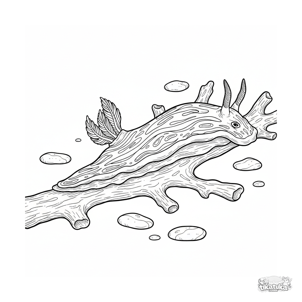Детальная раскраска для детей 10-12 лет: красочный голожаберный моллюск ползет по кораллу на солнечном мелководье. Стиль винтажной гравюры.