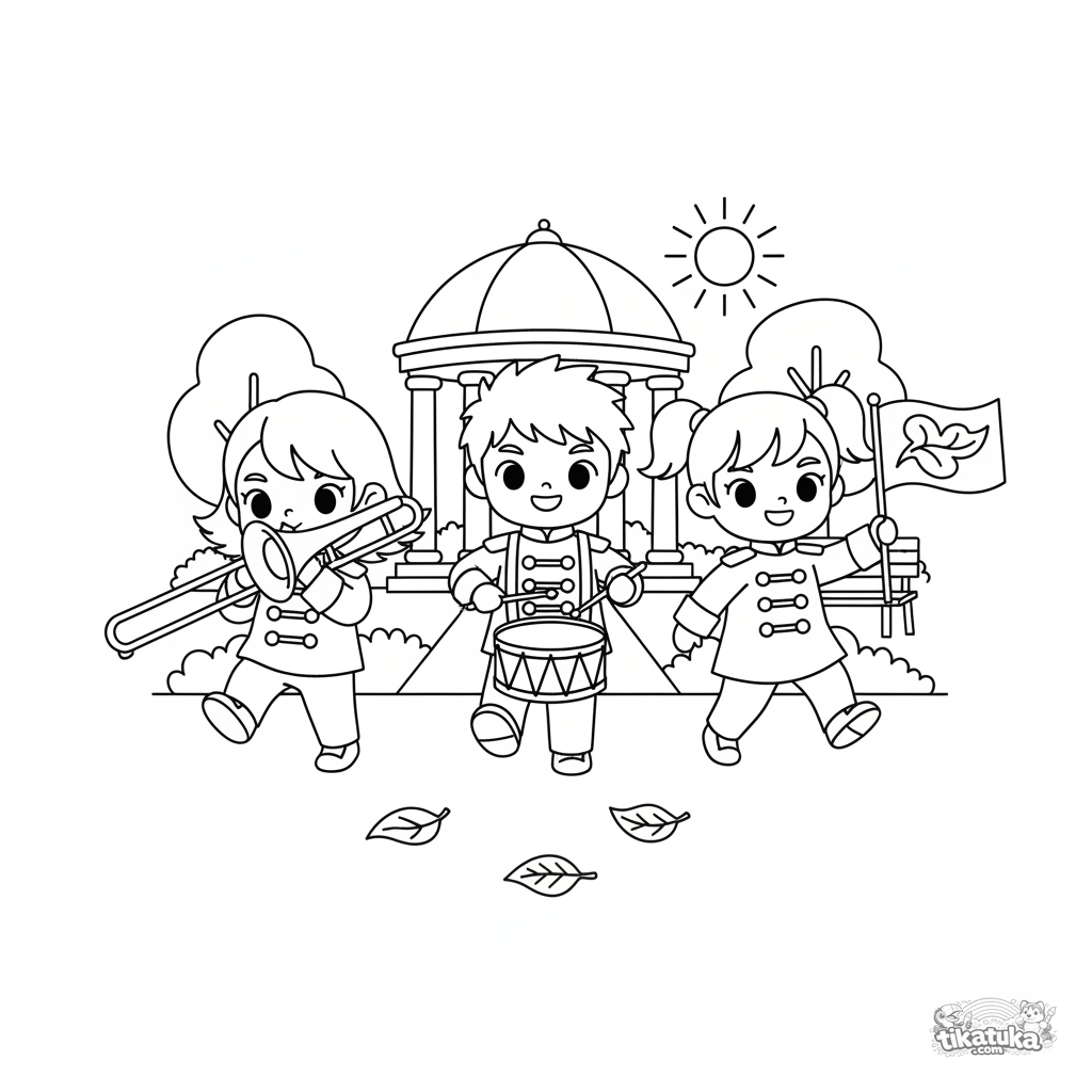 Раскраска для детей 6-9 лет: детский духовой оркестр репетирует в парке у беседки. Весёлая динамичная сцена в комикс-стиле.