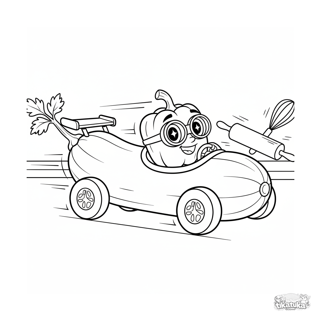 Раскраска для детей 7-9 лет: забавный кабачок в виде гоночной машины мчится по кухонной столешнице. Динамичная сцена, умеренная детализация.