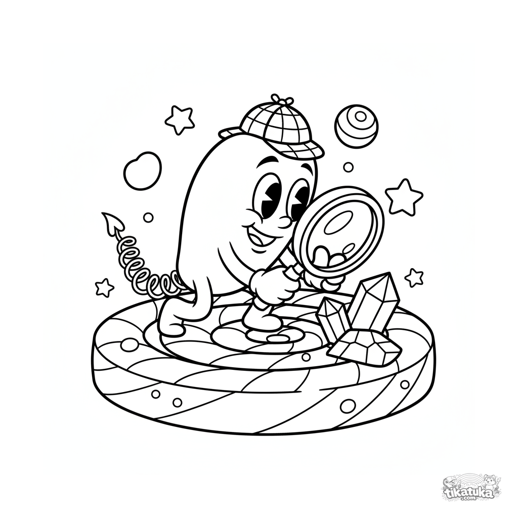 Раскраска для детей 4-6 лет: микроб в форме запятой в шляпе детектива ищет улики с лупой на поверхности леденца.