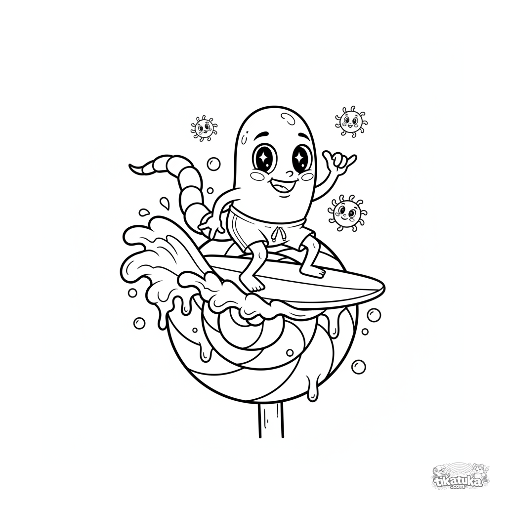 Раскраска для детей 4-6 лет: весёлый микроб в форме запятой катается на сладкой волне на поверхности леденца. Яркий и динамичный рисунок.