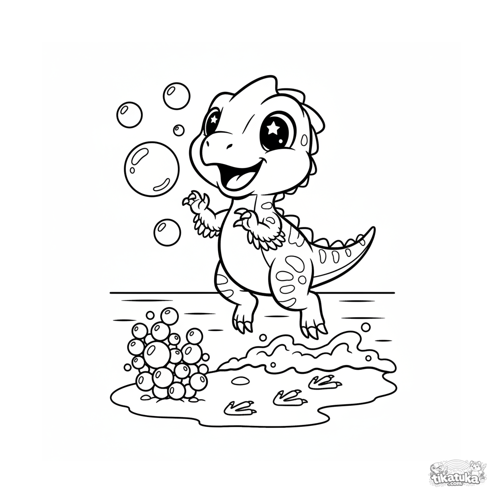 Простая раскраска для малышей 2-3 лет: маленький весёлый компсогнат прыгает за пузырями у самой кромки древнего океана. Огромная голова, милое лицо.