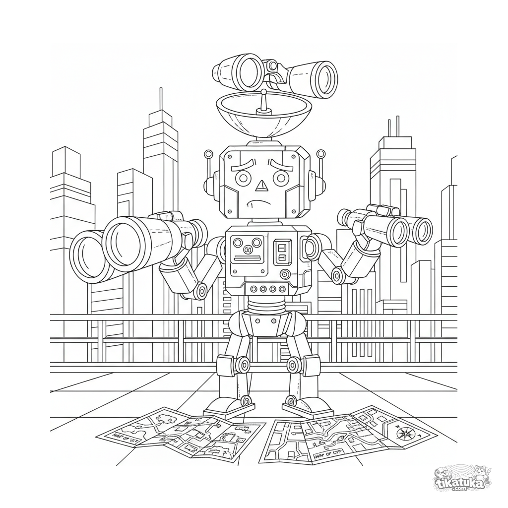 Раскраска для детей 10-12 лет: озадаченный робот на смотровой площадке пытается использовать три бинокля одновременно, высматривая зарплату. Технический мем с деталями.
