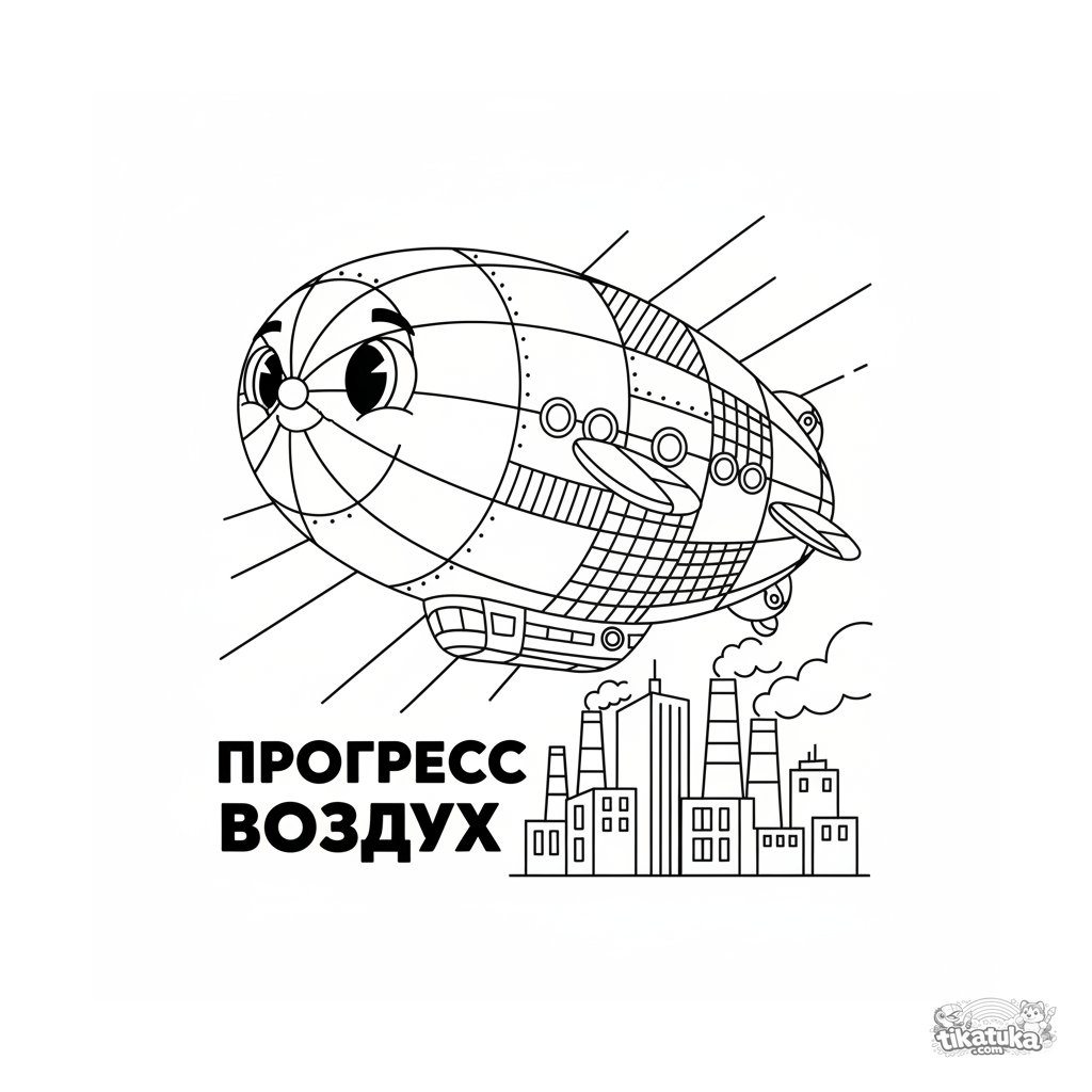 Стилизованная раскраска в стиле конструктивистского плаката 1930-х годов: геометрический дирижабль летит над городом. Для детей 10-12 лет, интересующихся искусством и историей.