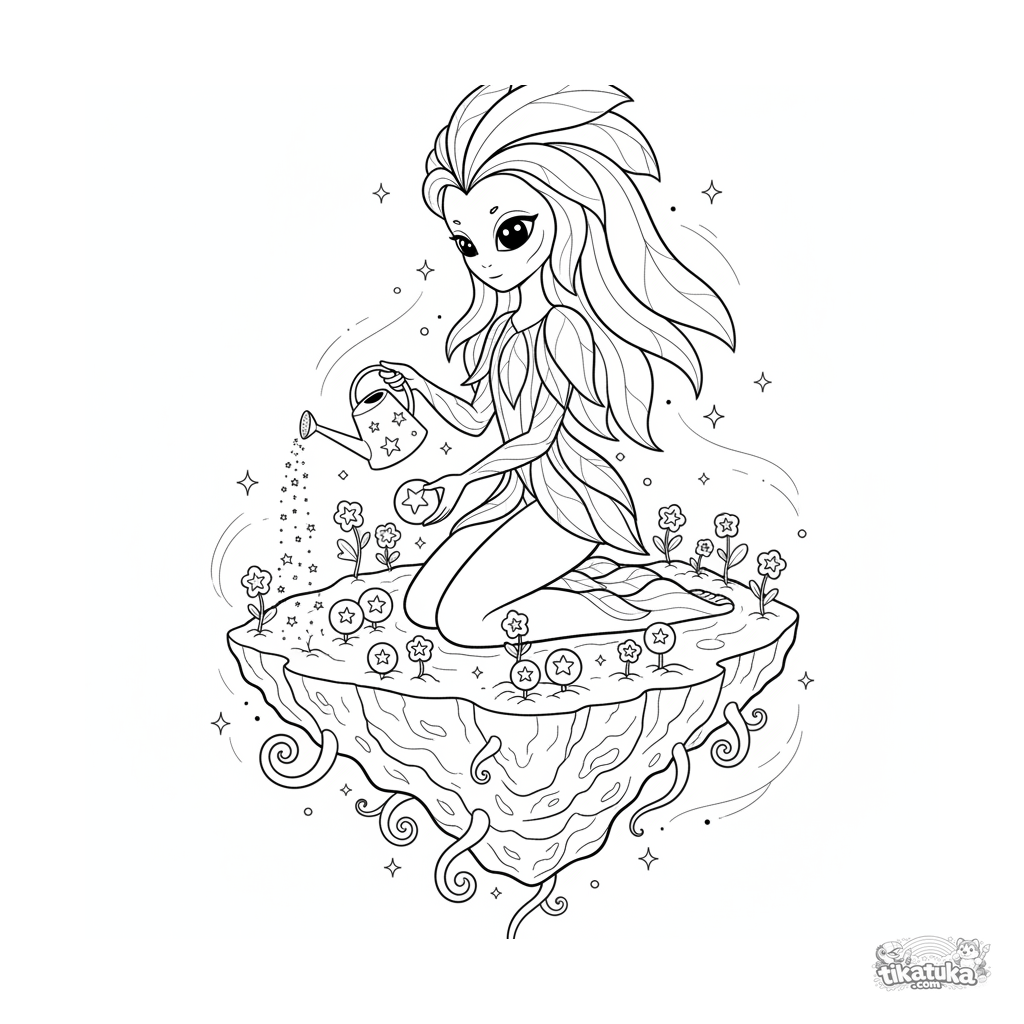 Раскраска для детей 7-9 лет: изящный инопланетный садовник сажает светящиеся звездные семена в космическом саду. Плавные линии в стиле ар-нуво, красивый и спокойный сюжет.