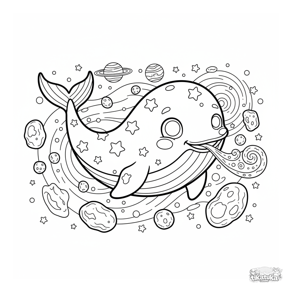 Раскраска для детей 7-9 лет: величественный космический кит с узорами из звёзд плывёт через пояс астероидов, выпуская звёздную пыль.