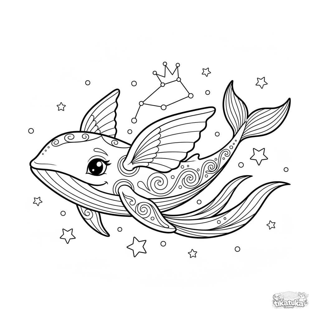 Сложная раскраска для 10-12 лет: величественный космический кит с узорами на теле плывет сквозь звездное скопление и созвездие. Плавные, художественные линии.