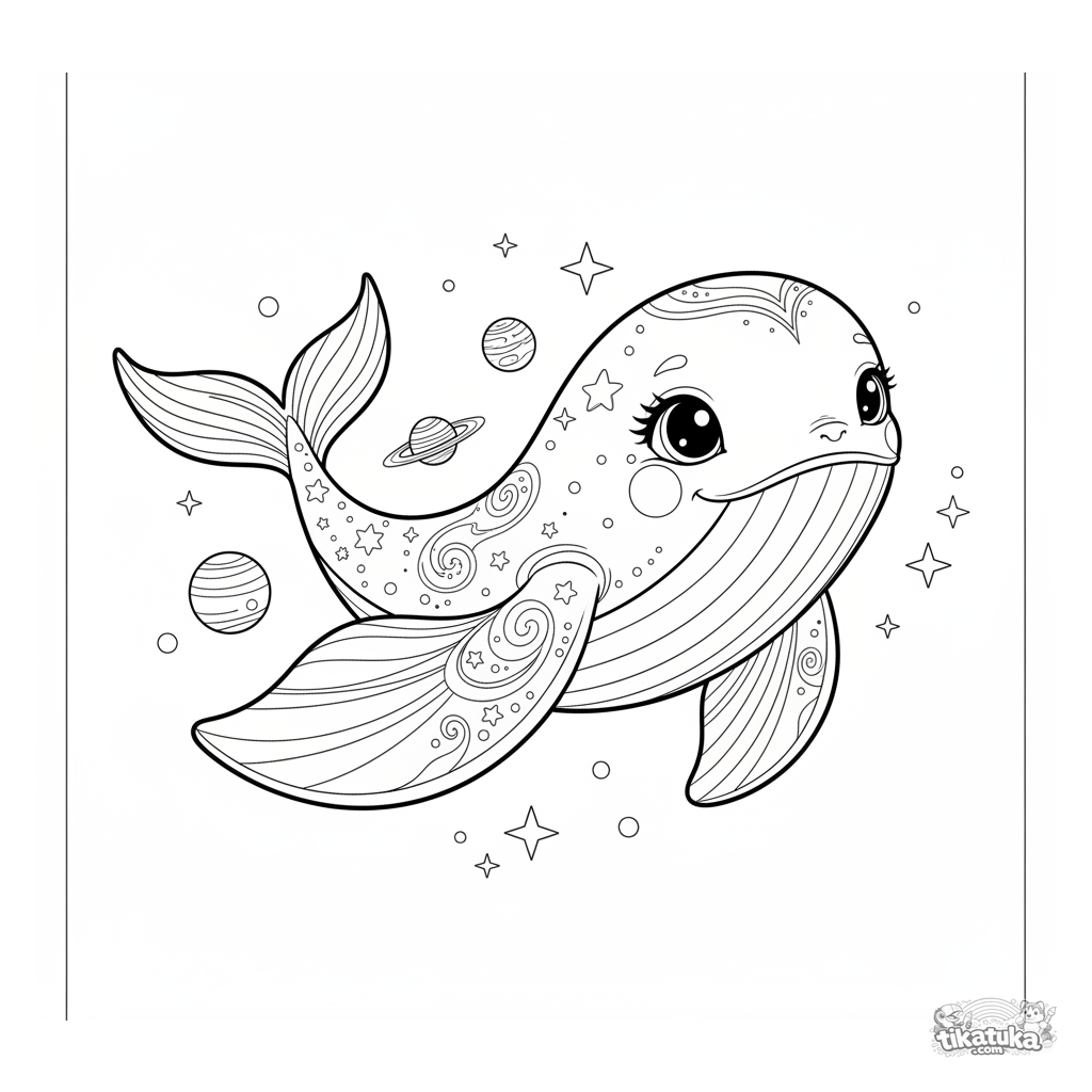 Раскраска для детей 7-9 лет: величественный космический кит, покрытый узорами, плывет через звездные просторы и туманности. Плавные, изящные линии.