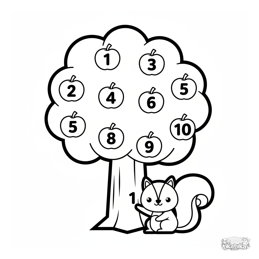 Обучающая раскраска для малышей: считаем яблоки от 1 до 10 на дереве с помощью веселой белочки. Простые формы и крупные цифры.