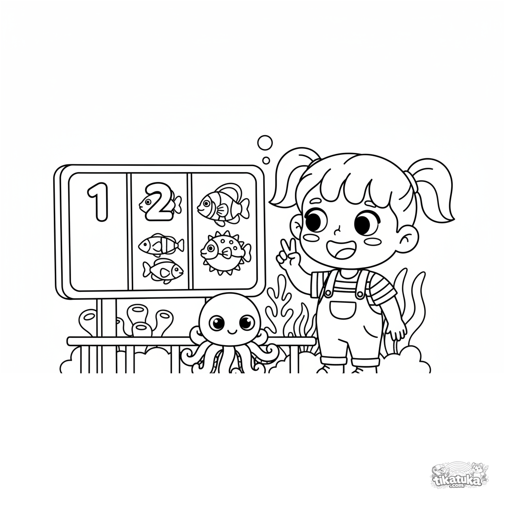 Раскраска для детей 4-6 лет: ребенок считает рыбок на табличке у аквариума в зоопарке. Яркие цифры, простые группы предметов, дружелюбный стиль.