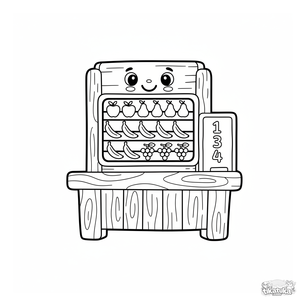 Обучающая раскраска для малышей: считаем фрукты на больших деревянных счетах рыночного ларька. Помогает выучить цифры 1, 2, 3, 4.