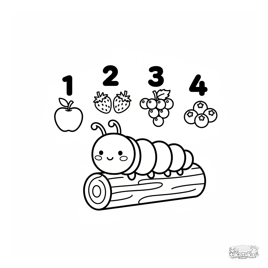 Обучающая раскраска для малышей: весёлая гусеница помогает считать фрукты от одного до четырёх. Крупные простые формы идеальны для самых маленьких.