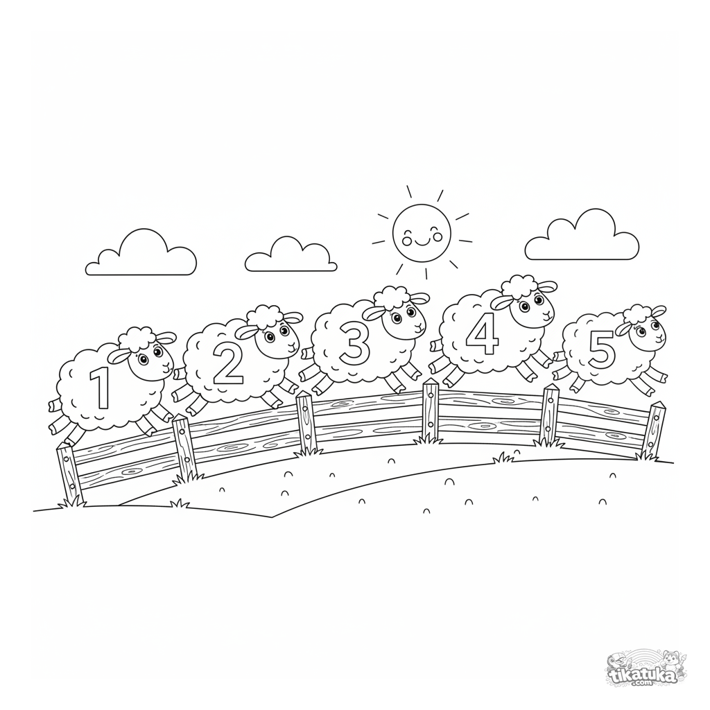 Обучающая раскраска для детей 4-6 лет: пять пушистых овечек с цифрами перепрыгивают через забор. Помогает выучить порядок чисел от 1 до 5 в игровой форме.
