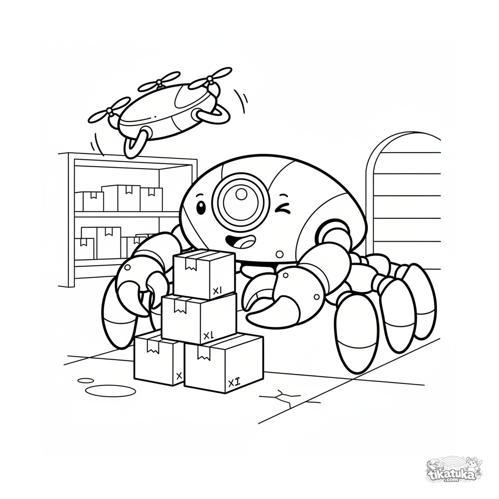 Раскраска для детей 7-9 лет: приземистый робот, похожий на краба, аккуратно складывает маленькие коробки в пирамиду на полу склада. Над ним пролетает дрон. Динамичная поза и детали.