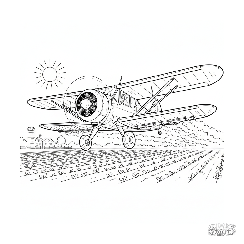 Раскраска самолета-опылителя, работающего над фермерскими полями. Для детей 7-9 лет. Четкие контуры, детали фермы, динамичный ракурс.