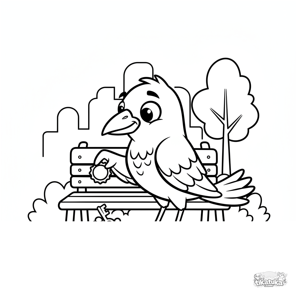 Раскраска для детей: умная ворона собирает блестящие предметы в городском парке. Стиль бумажной аппликации, простые формы.