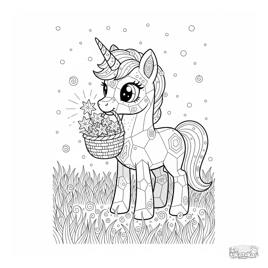 Сложная волшебная раскраска: кристальный пони-единорог с рогом из жеоды собирает светящиеся цветы в ночном лугу. Для детей от 8 лет.