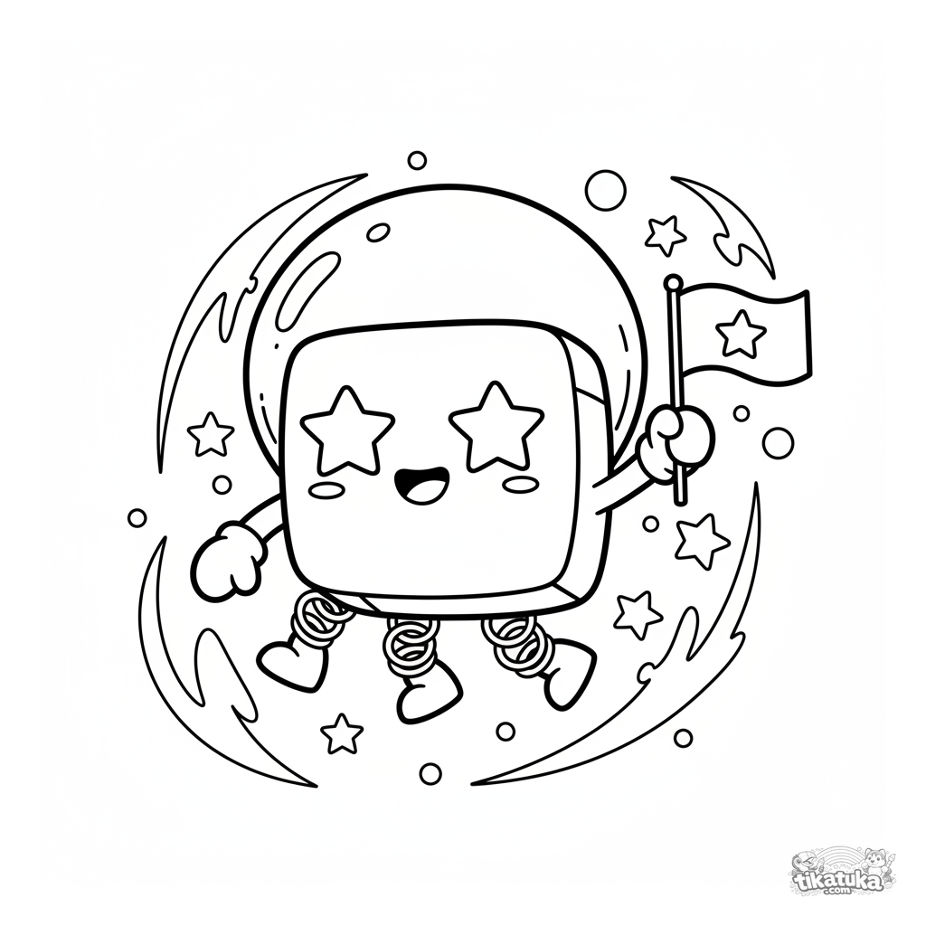 Раскраска с кубическим микробом-космонавтом, парящим в комикс-космосе. Для детей 4-6 лет. Яркий аниме-стиль, простые формы, динамичные линии, широкие поля.