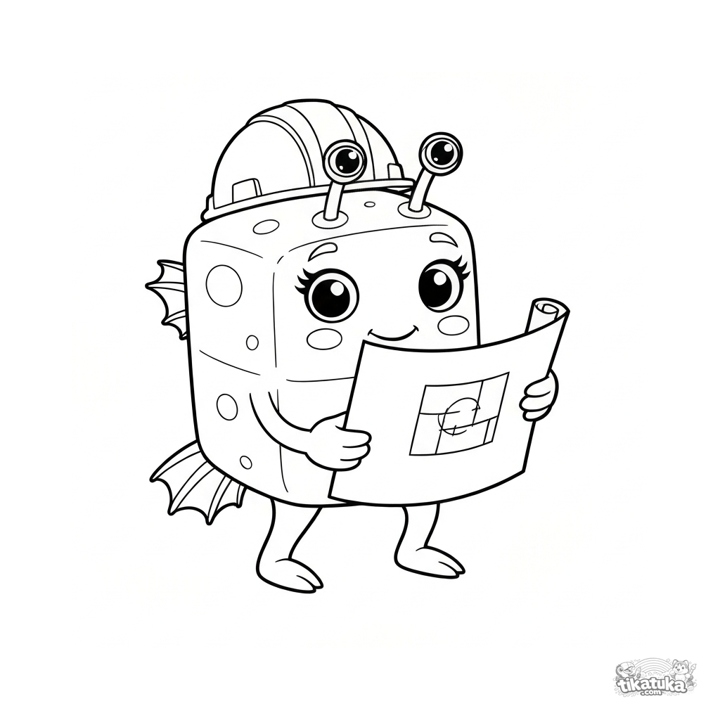 Раскраска для детей 6-9 лет. Квадратный микроб-строитель в каске с чертежом, плавниками и глазами-стебельками. Скачать бесплатно.