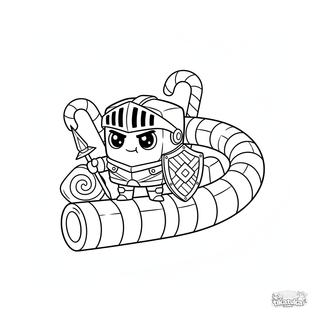 Раскраска для детей 7-9 лет: кубический микроб в роли рыцаря с копьём и щитом на поверхности леденца-замка. Сцена фантазийного приключения.