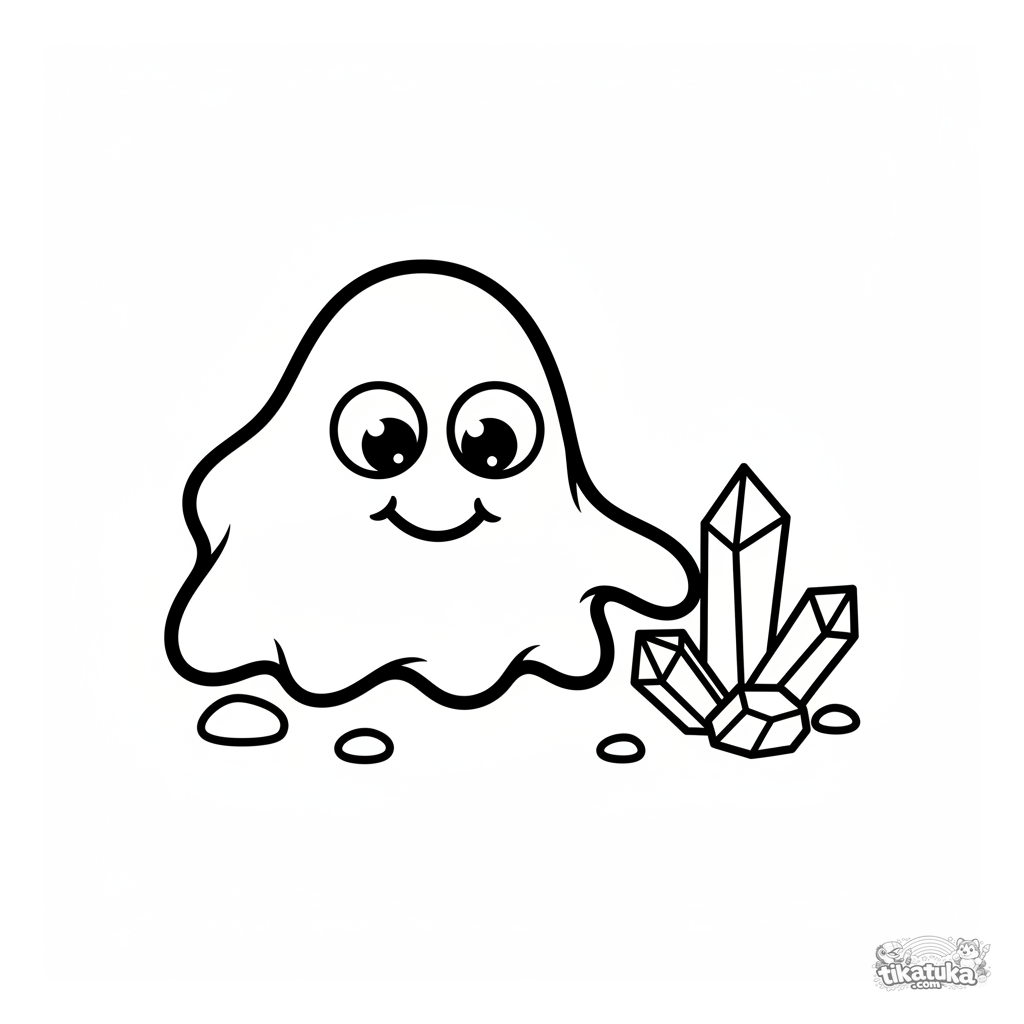 Раскраска для малышей 2-3 года: дружелюбная амёба с большими глазами исследует кристаллы. Очень простые формы, крупные детали, широкие поля для первых карандашей.