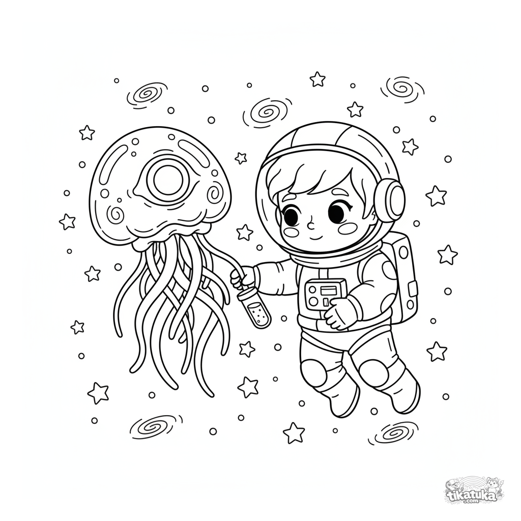 Раскраска для детей 10-12 лет: астробиолог в открытом космосе изучает дружелюбного медузообразного инопланетянина среди звёзд. Сложная сцена для творческого раскрашивания.