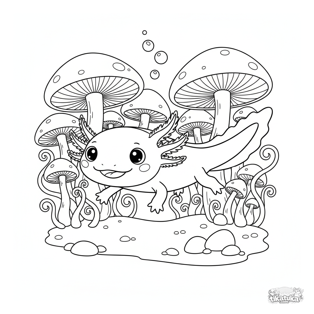 Раскраска для детей 4-6 лет: дружелюбный аксолотль плывет через волшебный подводный лес из гигантских светящихся грибов. Простые формы и милое выражение лица.
