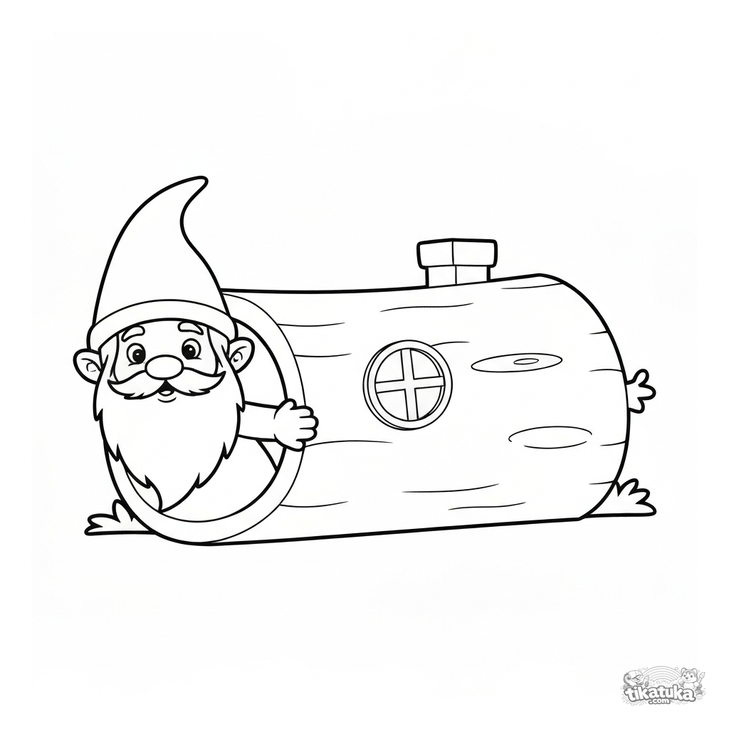 Раскраска для малышей: любопытный гном выглядывает из круглой двери своего домика-дупла в бревне. Простая милая сцена для детей 2-4 лет.