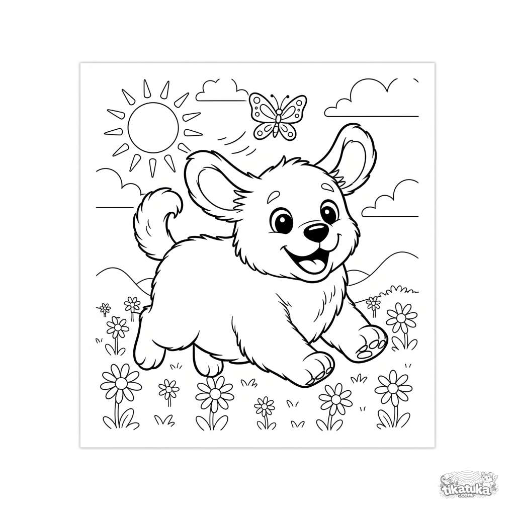 Раскраска для детей 4-6 лет: любопытный щенок золотистого ретривера весело гоняется за бабочкой на цветущем лугу. Простые формы и милое выражение мордочки.