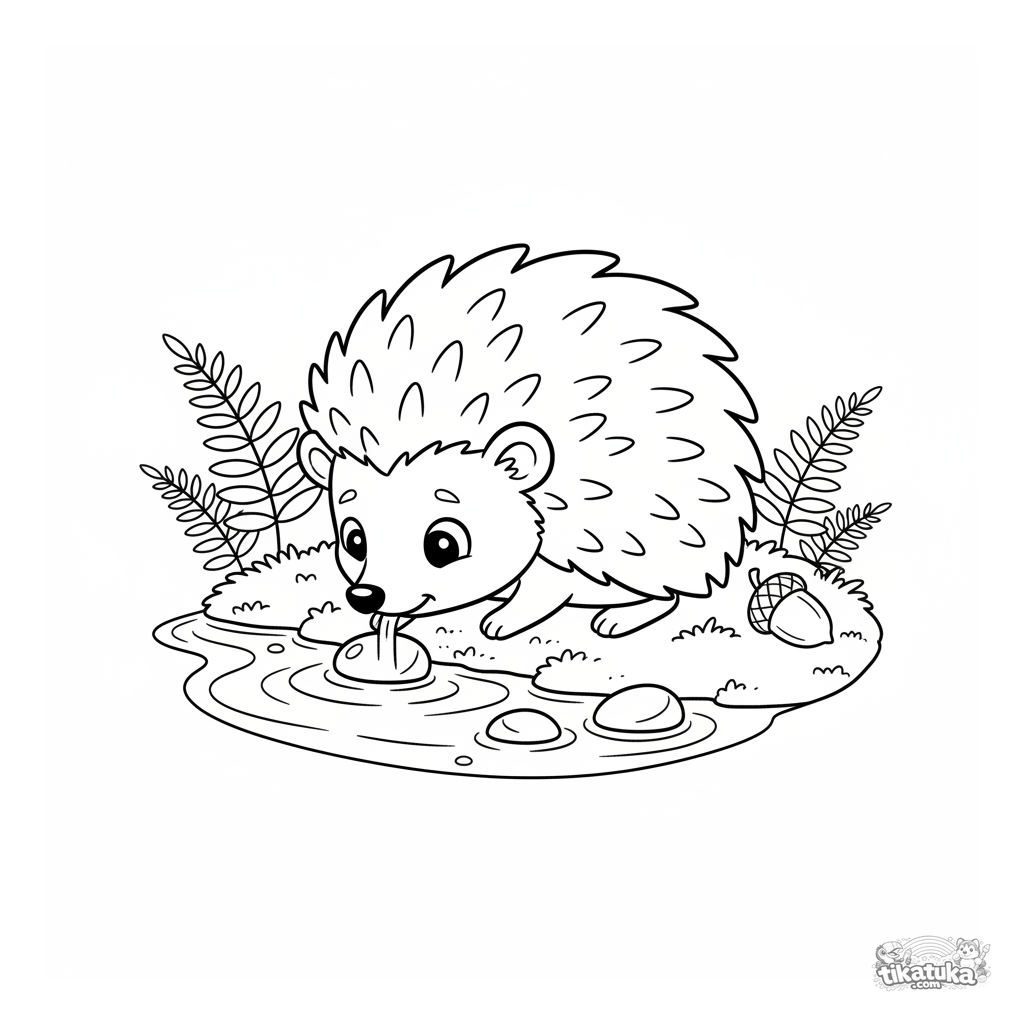 Раскраска для детей 4-6 лет: милый ёжик пьёт воду из прозрачного лесного ручья на моховом берегу. Простые формы, понятный сюжет, развивает моторику.