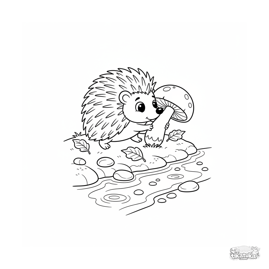 Раскраска для детей 4-6 лет: любопытный ёжик собирает грибы на мшистом берегу прозрачного ручья. Осенние листья и камешки вокруг.