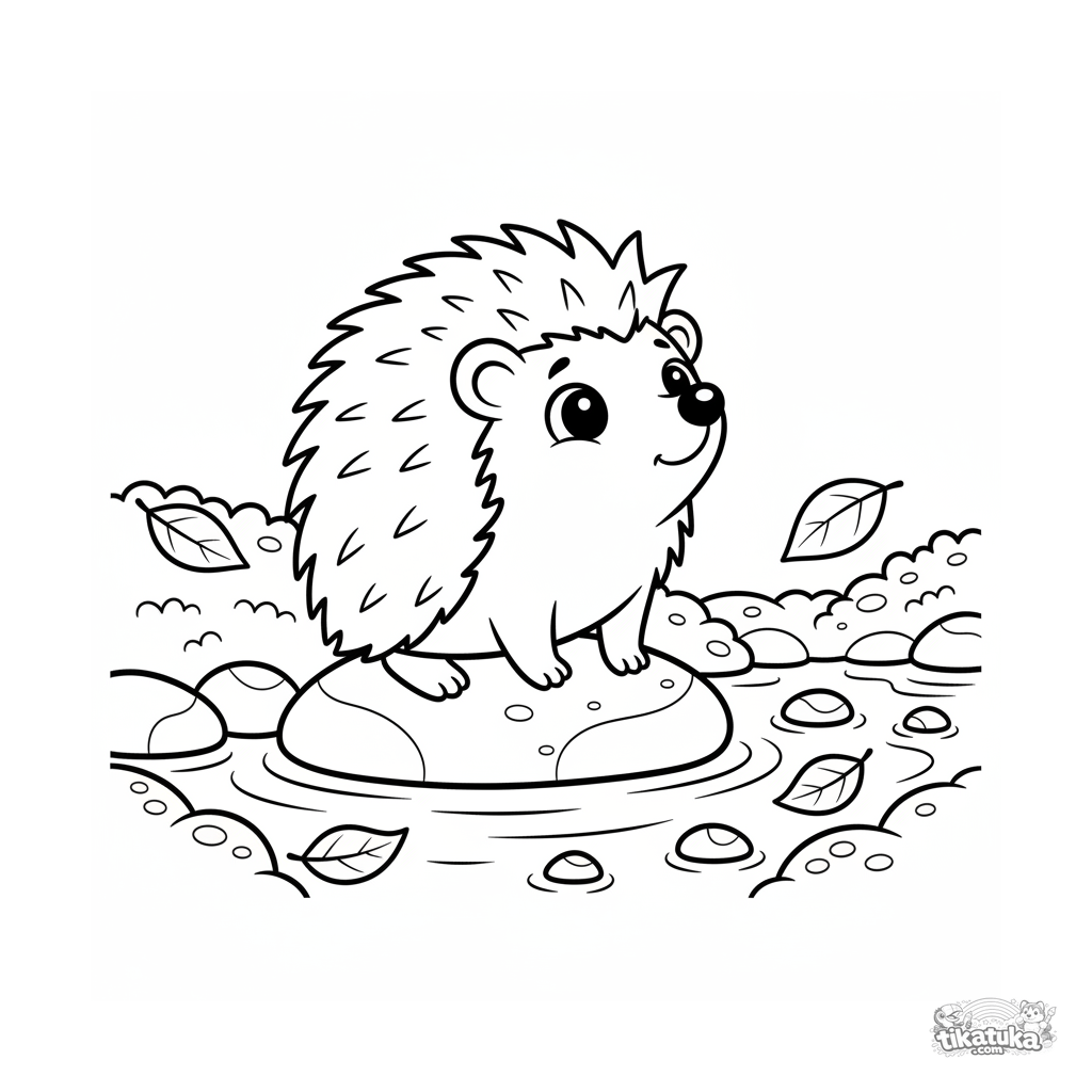 Раскраска для детей 4-6 лет: любопытный ёжик на мшистом берегу прозрачного ручья. Милая сценка осенней природы с камешками и листьями.